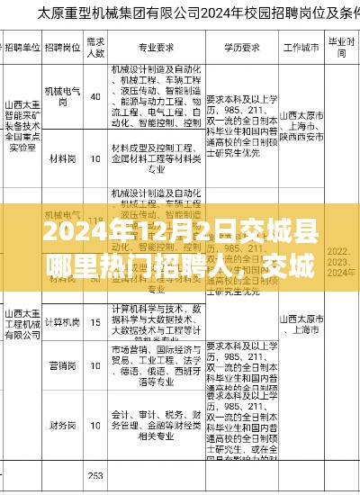 随着信息技术的快速发展,线上招聘市场日益繁荣,在交城县,乃至全国范围内,求职者与招聘方都在寻找一个高效、便捷、信息透明的招聘平台,本文将围绕“2024年12月2日交城县哪里热门招聘人”这一话题,对交城县的招聘市场进行深度评测,介绍相关产品的特性、使用体验、与竞品对比以及目标用户群体分析。